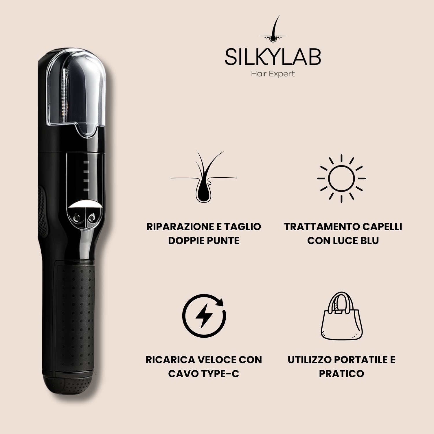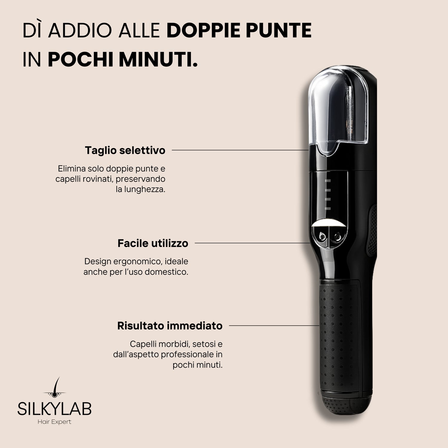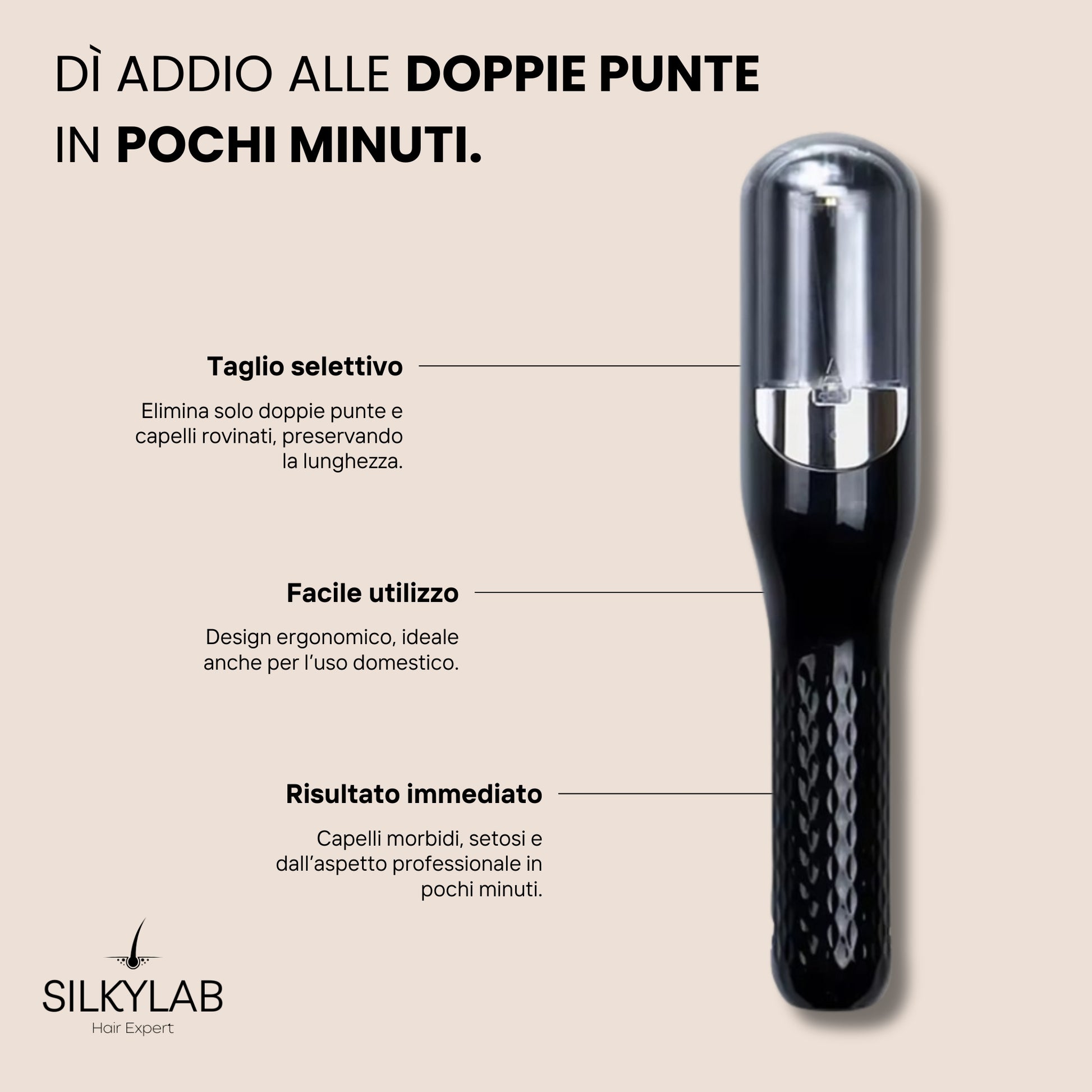 Il dispositivo taglia in modo selettivo solo le punte danneggiate, mantenendo intatta la lunghezza del capello e restituendo una chioma più sana e uniforme.